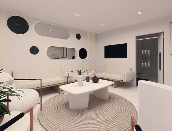 Bekleme alanında geometrik formlar ve dairesel tavan detaylarıyla mekânsal derinlik artırıldı.
